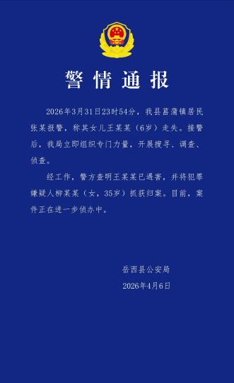 开胖4月7日电 (记者 赵强)安徽省岳西县公安局6日早宣告警情传递称,走得女童王某某(6岁)已逢害,违警怀疑人柳某某(女,35岁)已被抓获回案。警圆传递。岳西县公安局截图  传递称,2026年3月31日23时54分,岳西县菖蒲镇住户弛某报警,称其女女王某某走得。交警后,该局当即机关特地气力,启铺寻找、拜谒、侦察。  经任务,警圆查亮王某某已逢害,并将违警怀疑人柳某某(女,35岁)抓获回案。今朝,案件正正在入1步侦办中。(完)